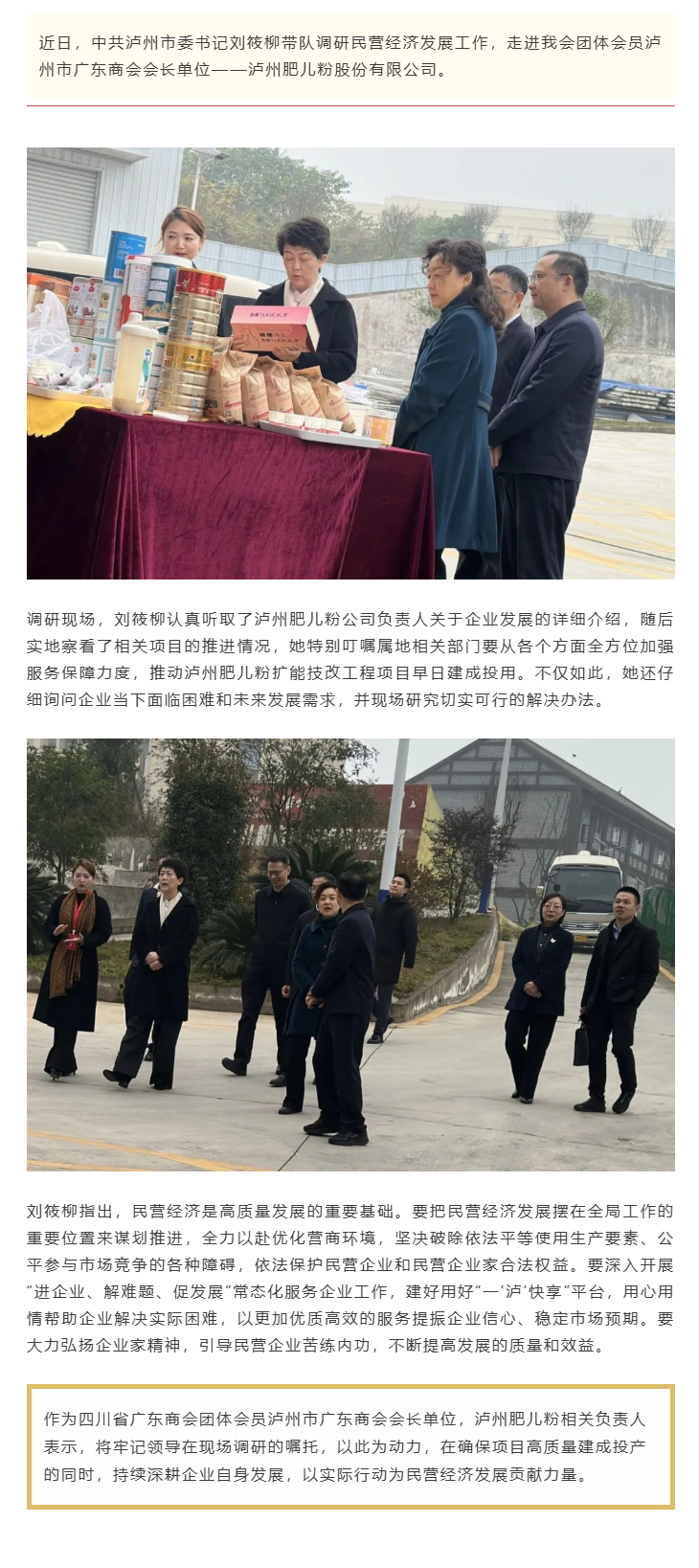 中共泸州市委书记刘筱柳调研我会团体会员泸州市广东商会会长单位——泸州肥儿粉股份有限公司